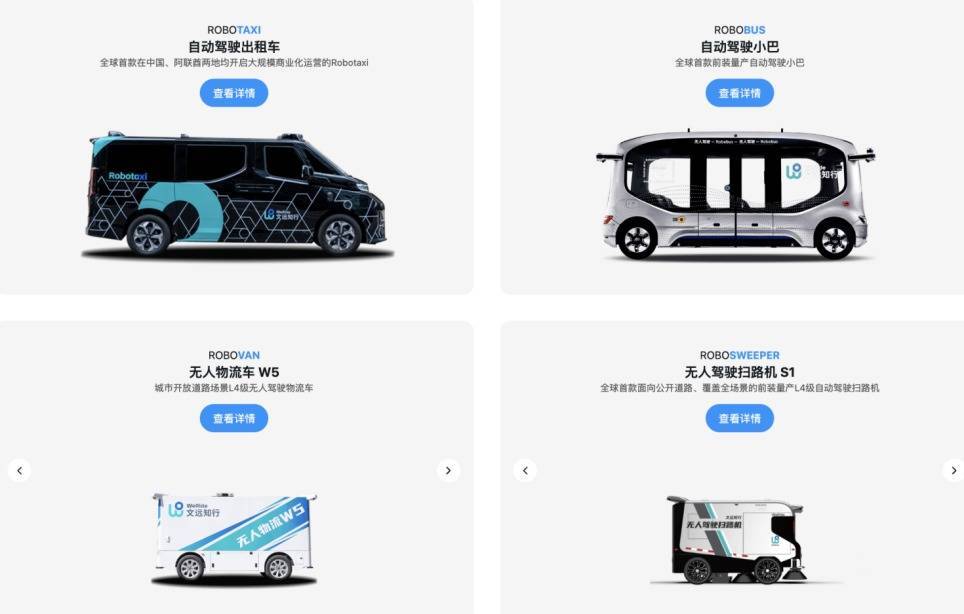 文远知行有4款自动驾驶产品,Robotaxi(自动驾驶出租车)、Robobus(无人驾驶巴士)、Robovan(自动驾驶货运车)、Robosweeper(无人驾驶环卫车)。