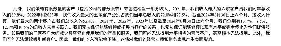 文远知行一直有客户集中度高的问题。2021年其前六大客户贡献了89.8%的收入,2022年和2023年前五大客户贡献的收入也分别达到72.0%和77.5%。截至2024年6月30日,仅前两大客户就占据了总收入的52.4%。